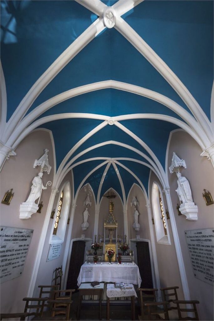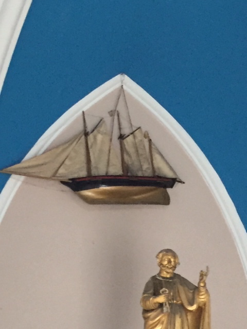 Concernant le modèle qui se trouve dans cette chapelle, il pourrait s’agir d’une goélette à trois mâts.