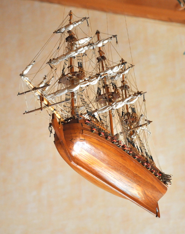 Après avoir été dépoussiérée, recollé les petites pièces cassées, remonté le mât de misaine et retendu les fils et filets, je l’ai donc suspendu dans notre maison. Cela fait, de cette maquette, un très bel ex-voto suspendu. Les fils de suspension étant presque invisibles, on a l’impression que cette maquette vole dans la pièce !!!.